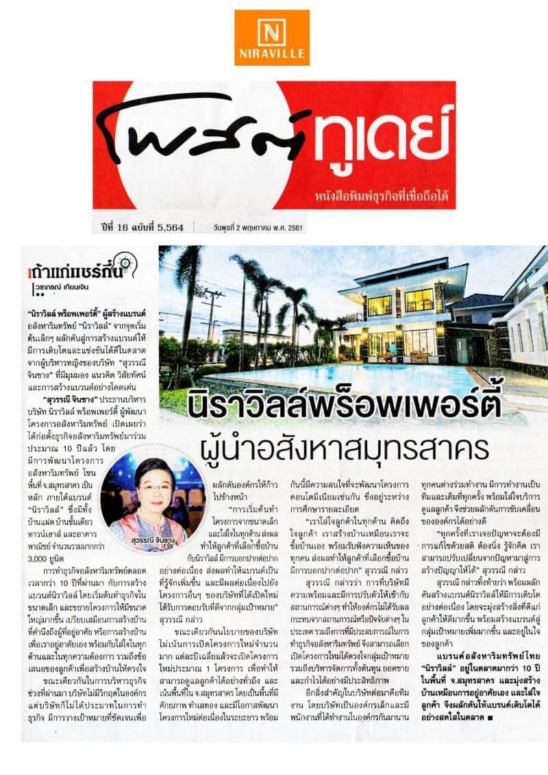 ขอแสดงความยินดีกับ คุณสุวรรณี จินชาง กรรมการผู้จัดการ บริษัทนิราวิลล์ พร็อพเพอร์ตี้ จำกัด กับรางวัลอันทรงเกียรติ “นักบริหารดีเด่น ประจำปี 2561 สาขา บริหารและพัฒนาธุรกิจอสังหาริมทรัพย์” มอบรางวัลโดยสำนักงานมูลนิธิเพื่อสังคมไทย