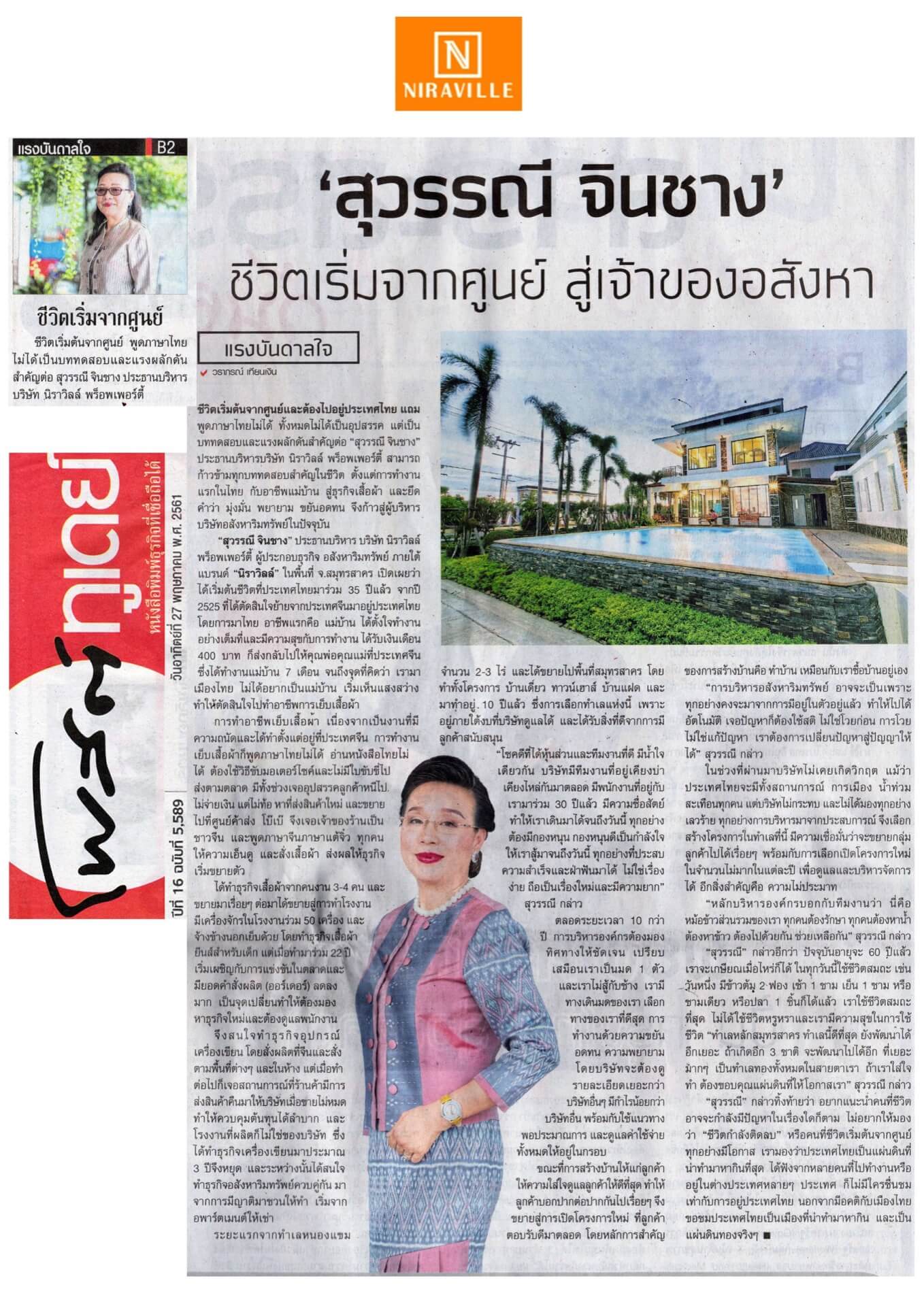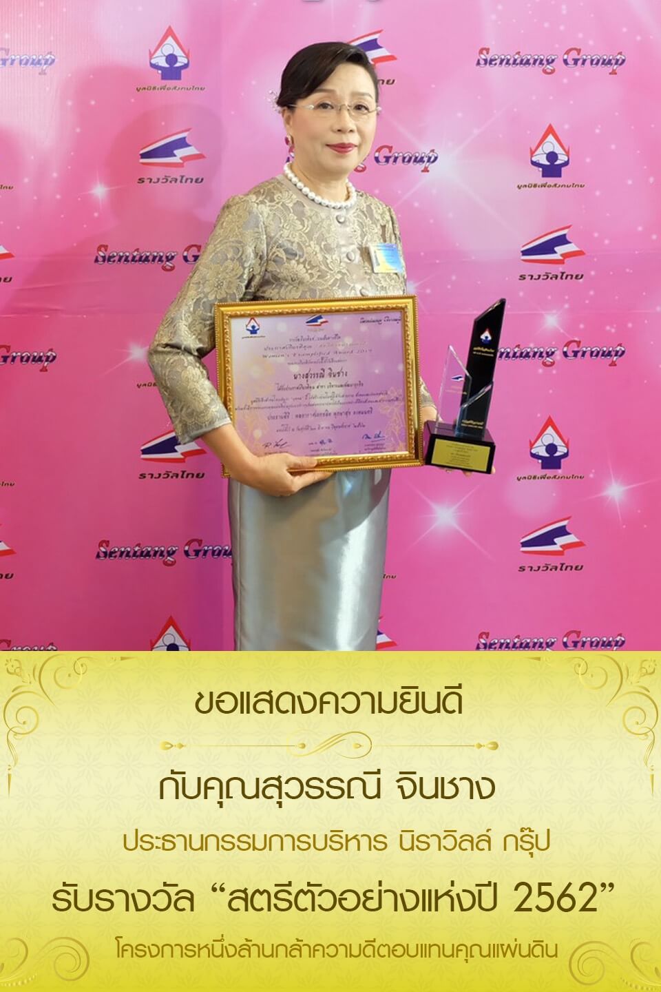 ขอแสดงความยินดีกับ คุณสุวรรณี จินชาง ประธานกรรมการบริหาร นิราวิลล์กรุ๊ป